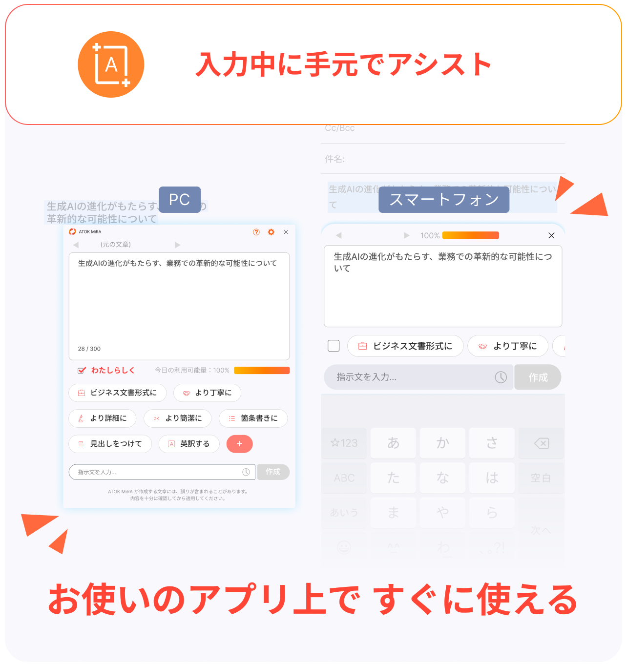 ATOKが長きにわたり積み上げてきた日本語技術の成果として、新たなAIライティング体験をお届けします。