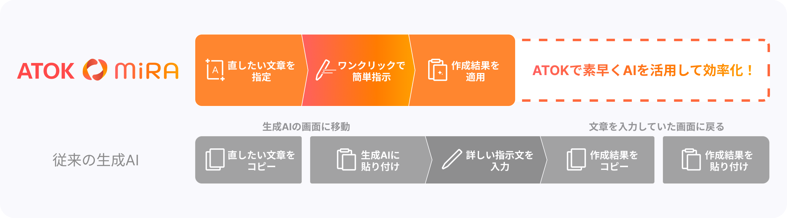 「ATOK MiRA」は入力・編集の延長線上でシームレスに操作して、文章の改善や修正に役立てることができます。