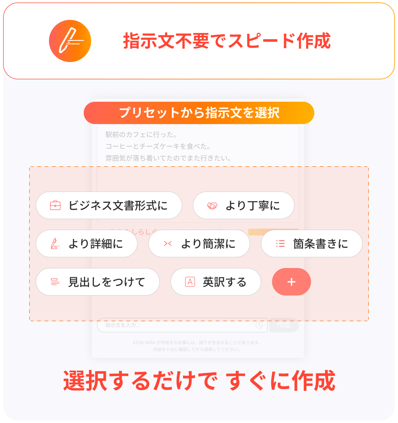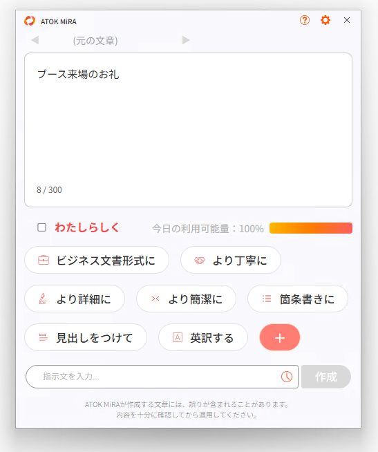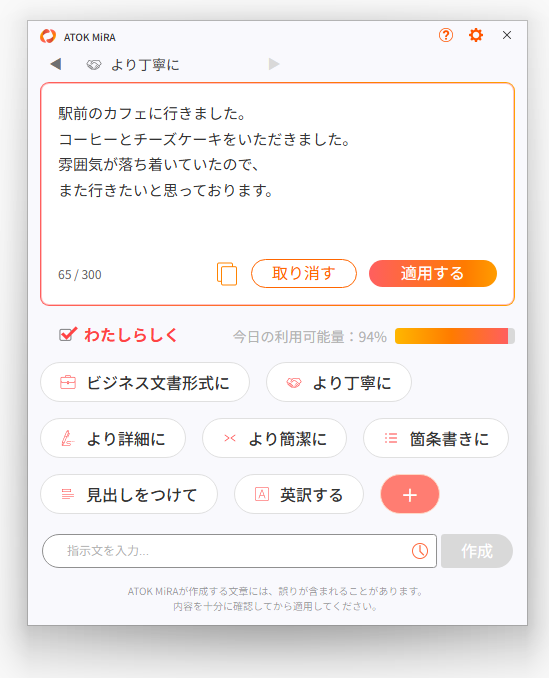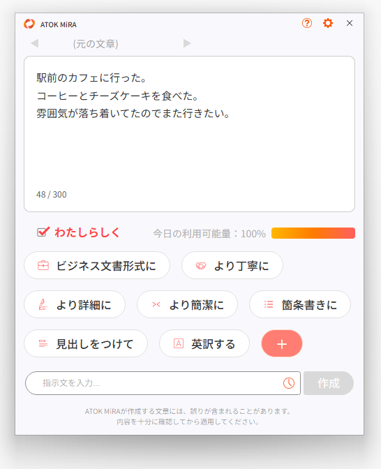 また、ATOK MiRAで作成される文章には、現在ご利用中のATOKの特徴が反映され、“わたし”らしい文体の傾向をふまえた文章を作成できます。