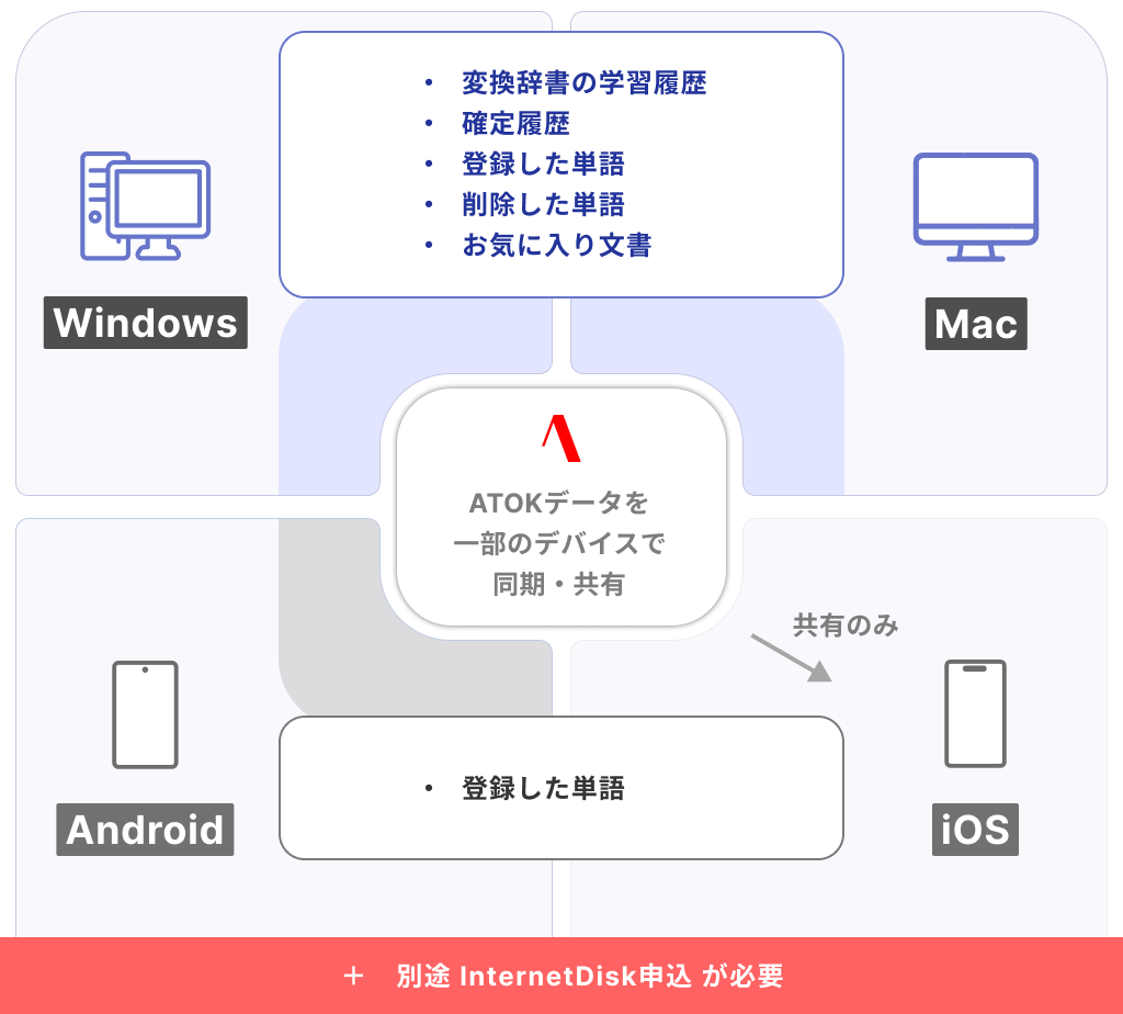 • 「ATOK Sync アドバンス」は、ATOK Passportのご契約中は無料でご利用いただけます。Mac以外の環境でご利用いただくには、各デバイスに対応したATOKが別途必要です。