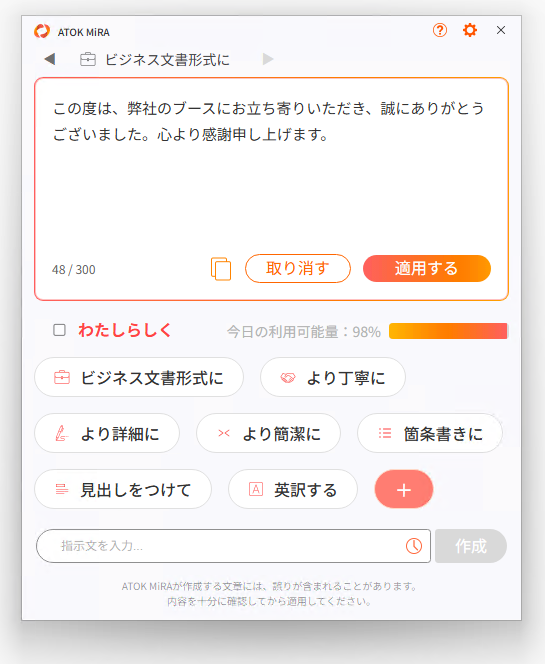 また、ATOK MiRAで作成される文章には、現在ご利用中のATOKの特徴が反映され、“わたし”らしい文体の傾向をふまえた文章を作成できます。