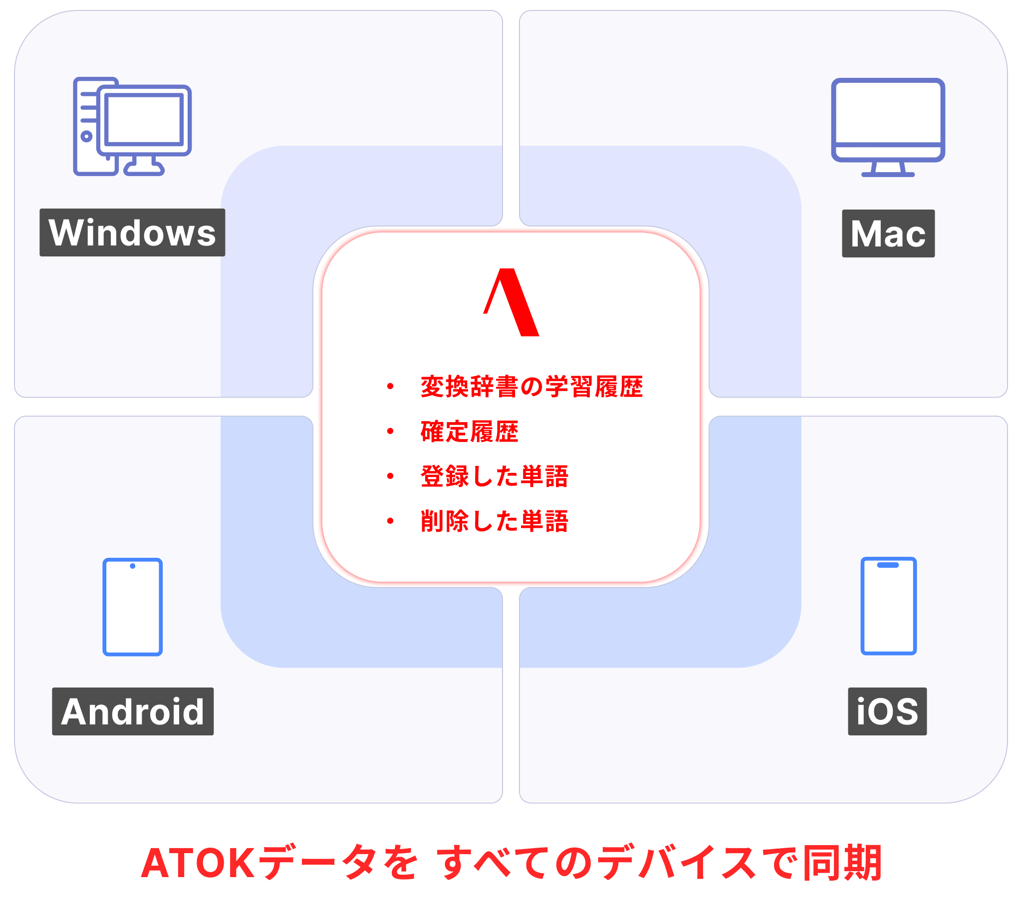ATOK Sync APを使って、Windows、Mac、Android、iOSの端末間で登録した単語を同期できるので、使い慣れた自分仕様のATOKがいつでもどこでも利用できます。Windowsどうし、Macどうしであれば、学習情報、確定履歴、登録した単語、お気に入り文書も同期できます。