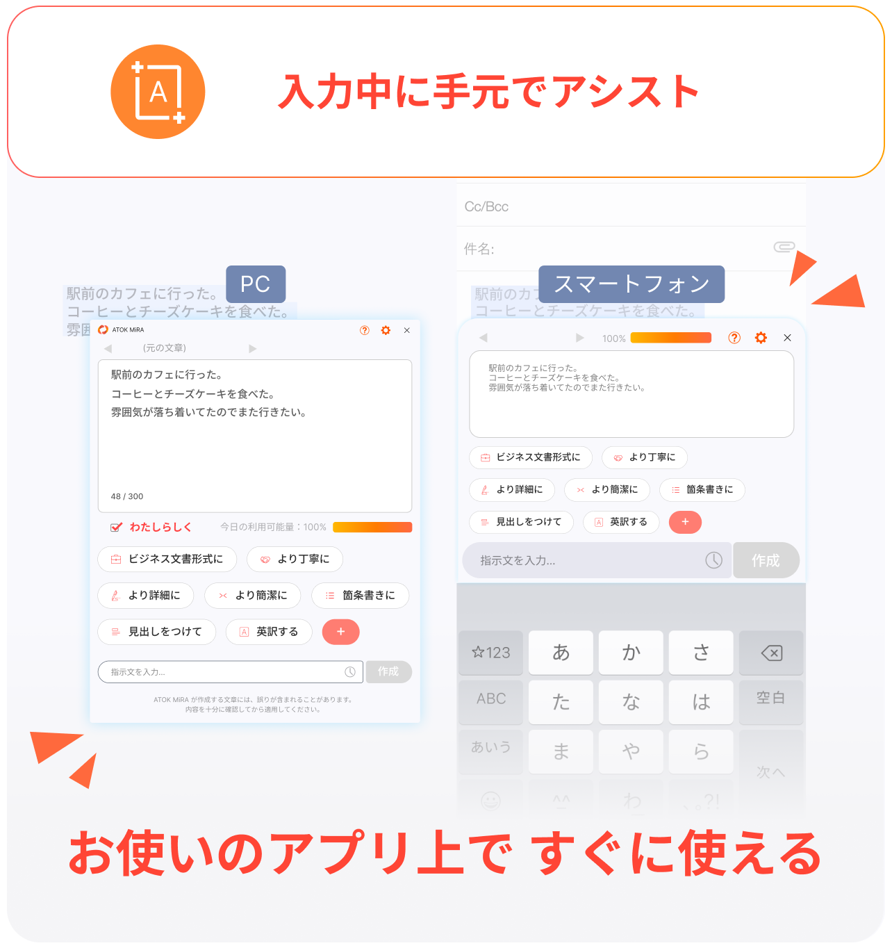 ATOK MiRAは、文章作成のフェーズに応じて、主に二通りの操作方法でお使いいただけます。