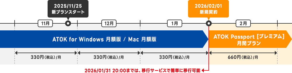 現在、「ATOK for Windows 月額版 / Mac 月額版」をご契約いただいているお客様は、2026年2月1日以降、ATOKが使えなくなりますので、ATOKを利用継続したい場合は、移行サービスをご用意していますので、ご自身で、1月31日(土) 20時までに、「ATOK Passport [プレミアム] 月間プラン」月額660円(税込)への移行をお申し込みください。