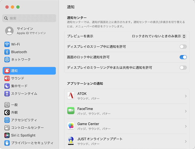 後から設定を変更する場合には、システム設定を起動し、「通知」を選択します。